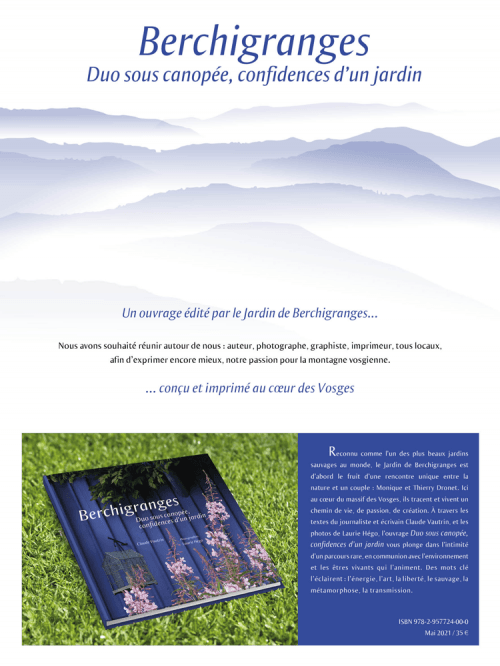 Répondre aux questions de nos visiteurs, c'est la raison de notre engagement dans la réalisation de cet ouvrage. Il nous fallait pour cela un regard extérieur. Qui de mieux qu'un voyageur amoureux des Vosges et des gens, comme Claude Vautrin, que nous avions croisés à différents moments de l' histoire de notre jardin. Le temps d'un automne et d'un hiver le duo s'est fait trio. Quel plaisir ce fut d'échanger, de partager anecdotes et réflexions avec ce bon génie grand reporter, pour le moins éloigné de ses voyages. Nous avons conçu ce livre comme nous vivons notre jardin, avec plaisir et sincérité sans garde-fou, sans fléchage, sans étiquette, dans un échange en toute liberté. Commandez le livre en ligne dès maintenant order the book online |